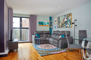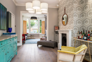 Un panou sau un perete de tapet decorativ este un truc minunat pentru a anima un living obișnuit. Există tone de imagini de fundal cu buget redus – comandă eșantioane înainte de a alege modelul, astfel încât să ai încredere în ceea ce privește finisajul, culorile și modelul. Un model geometric îndrăzneț ca cel din imagine oferă într-adevăr un design grandios într-un spațiu modest.