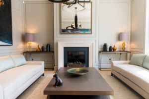 În această cameră, un afișaj simetric de vaze și lămpi pe ambele părți ale șemineului conferă un sentiment sofisticat. În mod similar, canapelele flanchează măsuța de cafea pentru o atmosferă formală pentru saloane.