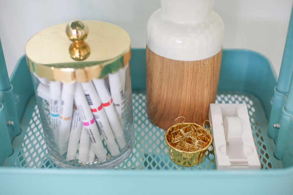 Găsește o selecție de containere pentru consumabilele de birou mai mici. Borcanele transparente arată bine pentru depozitarea pixurilor. În vasele mici sau în boluri poți pune elemente precum agrafe de hârtie, bandă și multe altele. Poți fi creativ și îți poți crea singur containerele ideale, din recipiente de lumânări, borcane sau