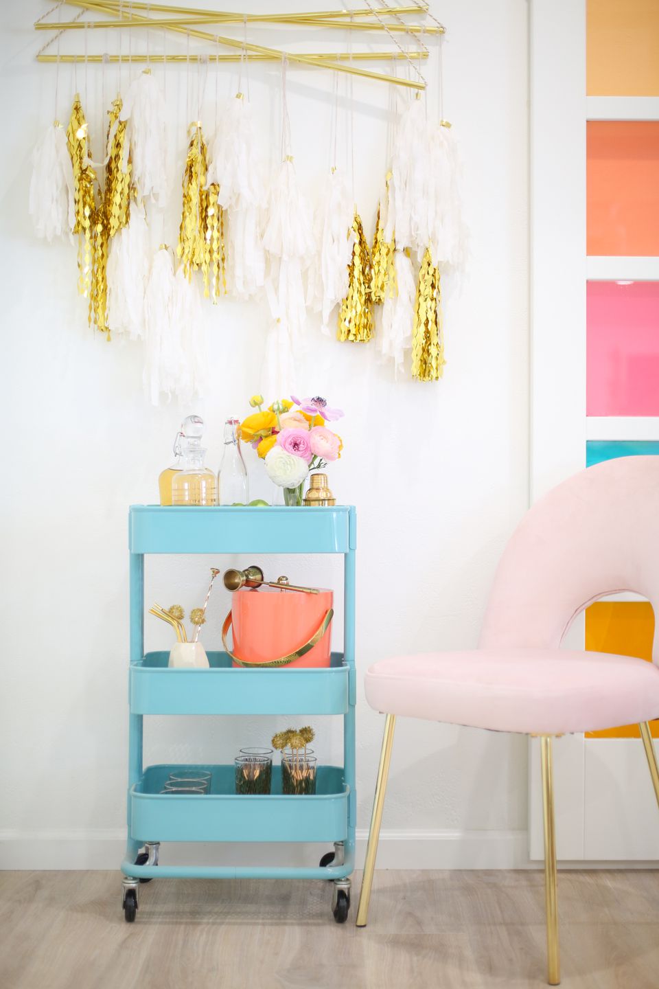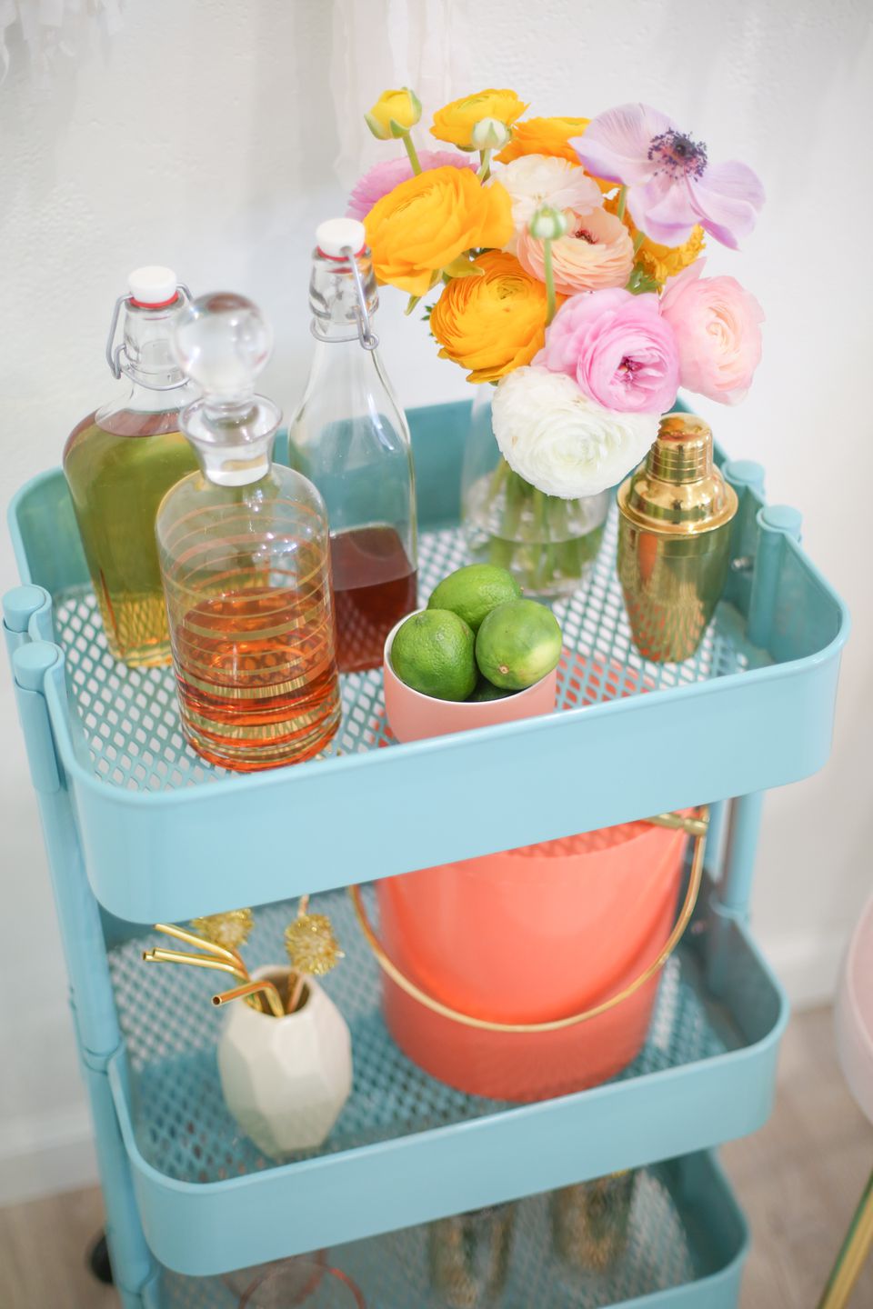 Noroc! Acest coș funcțional poate deveni un bar portabil perfect. Este dimensiunea potrivită pentru a depozita toate necesitățile, iar roțile îl fac ideal pentru deplasarea din cameră în cameră, dacă te distrezi. Păstrează-l la dispoziție cu ingrediente și instrumente pentru a-ți face toate mixurile preferate.