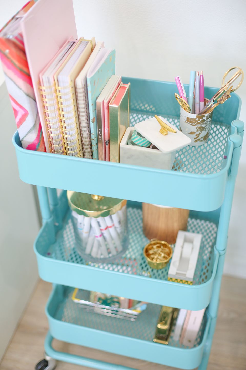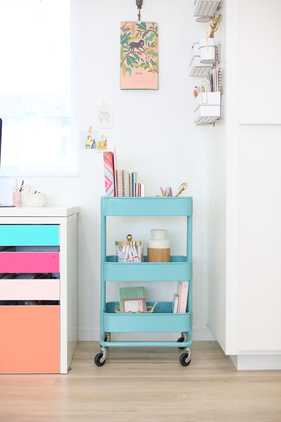 Căruciorul cu trei niveluri este dimensiunea perfectă pentru biroul de acasă și pentru a-ți depozita toate obiectele și ideile, mai ales dacă nu ai o mulțime de spațiu de depozitare în birou sau sertare. De la scotch la agrafe, citește mai departe modalități eficiente și adorabile de a încorpora Råskog în biroul tău.