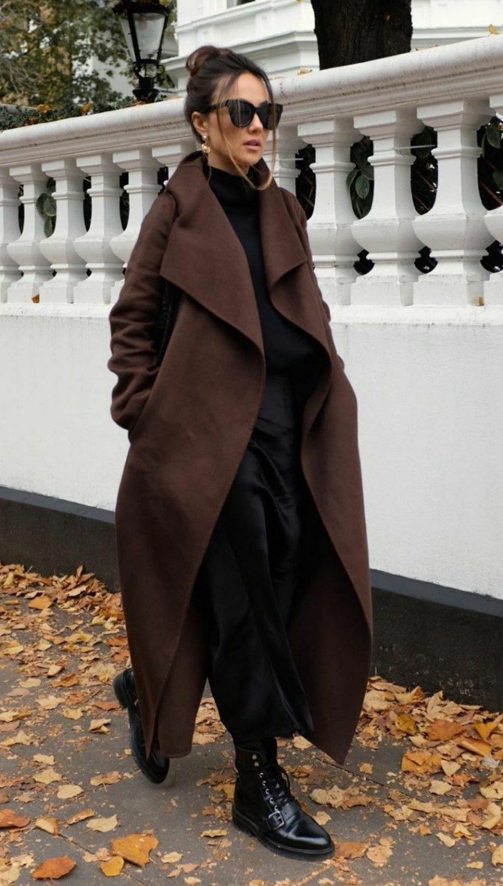 Pentru un aspect sofisticat, alege un palton cu cordon din stofă de lână într-o nuanță elegantă de ciocolatiu. Această culoare exprimă eleganță și se potrivește oricui. Avantajul lui este că nu înăsprește trăsăturile, așa cum o poate face un palton negru. În funcție de lungimea și croiala aleasă, acesta poate sublinia silueta sau poate fi purtat lejer, perfect pentru femeile care preferă un stil clasic și versatil.