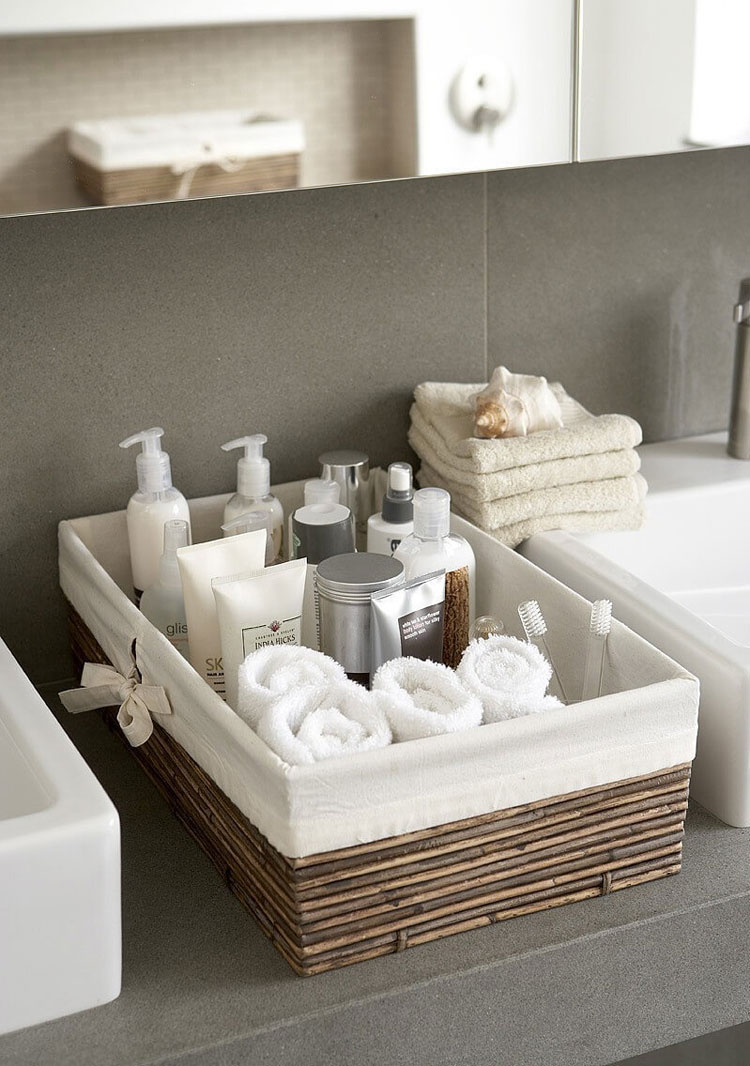 Sortează toate produsele de toaletă și igienă personală pe categorii și apoi depozitează fiecare categorie în câte un coș împletit. Astfel îți va fi mult mai ușor să le găsești atunci când vei avea nevoie. În plus, vei scurta considerabil timpul alocat curățeniei și ordinii din baie.