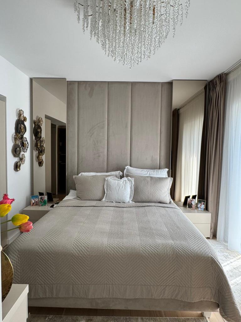 Încăperea destinată dormitorului matrimonial este de dimensiuni foarte mici și în acest caz s-a apelat la nuanțe de bej pentru a nu încărca spațiul și la oglinzi pentru mărirea sa.