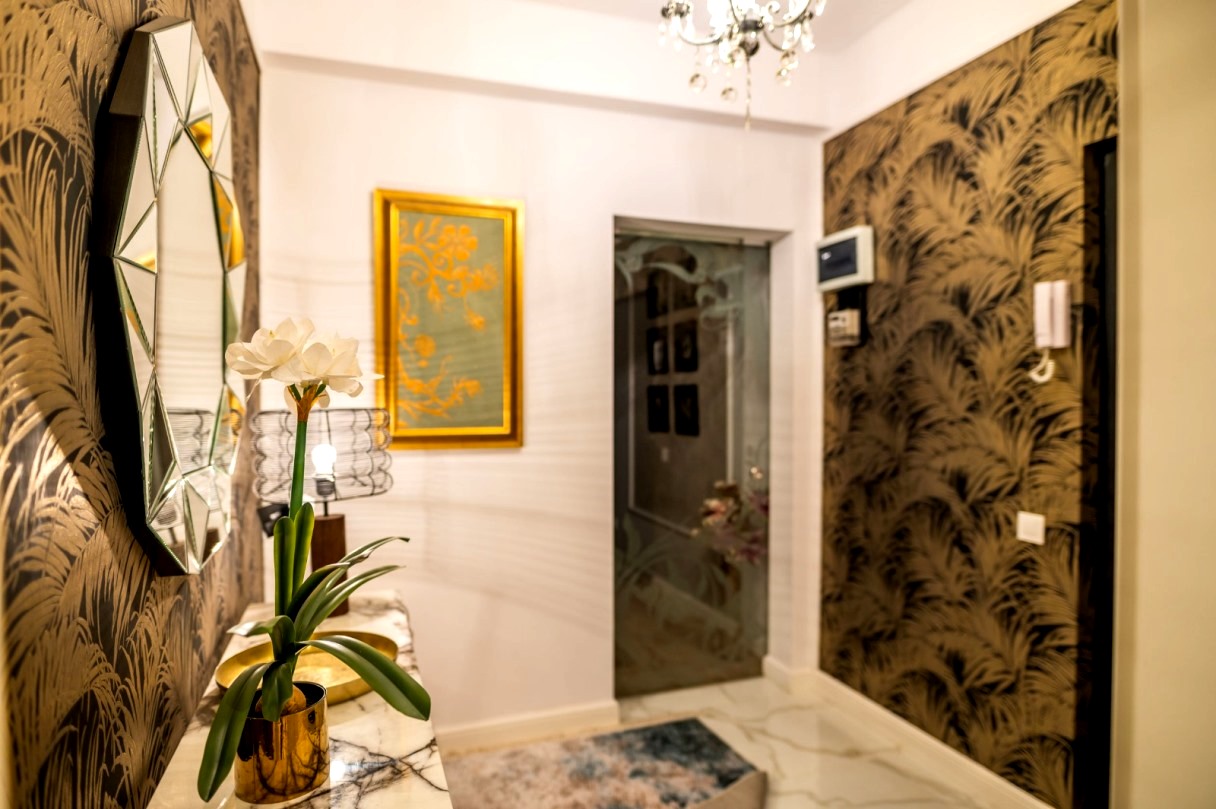 Accente glam sunt realizate prin intermediul tapetului cu modele spectaculoase, candelabrelor şi oglinzilor