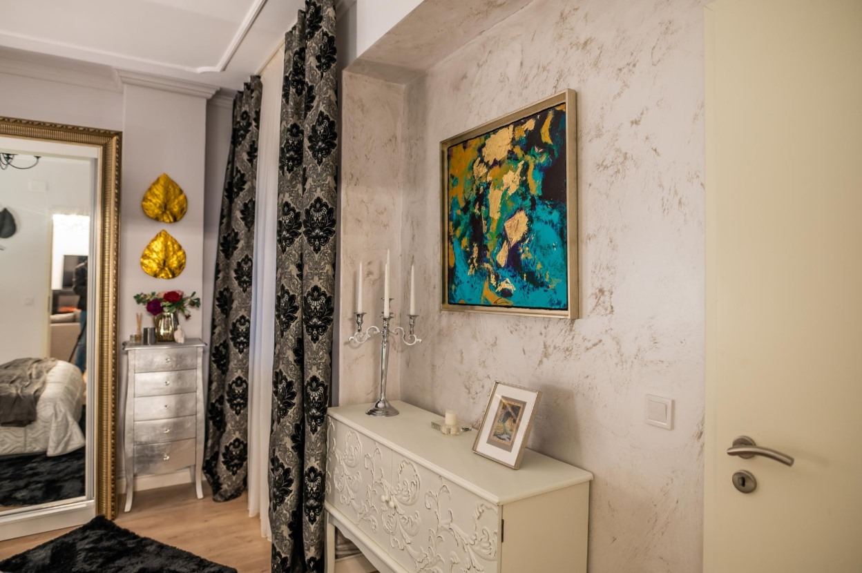 Accente glam sunt realizate prin intermediul tapetului cu modele spectaculoase, candelabrelor şi oglinzilor