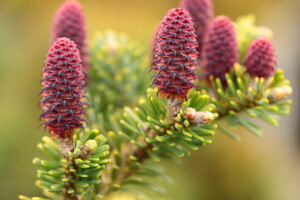 Exemplarele tinere, produc conuri de 7-8 cm, așezate perpendicular pe crengi, de culoare albastru gri ce devin apoi roz sau purpurii. Ele apar în mănunchiuri, un brad formȃnd 30-40 de conuri.
