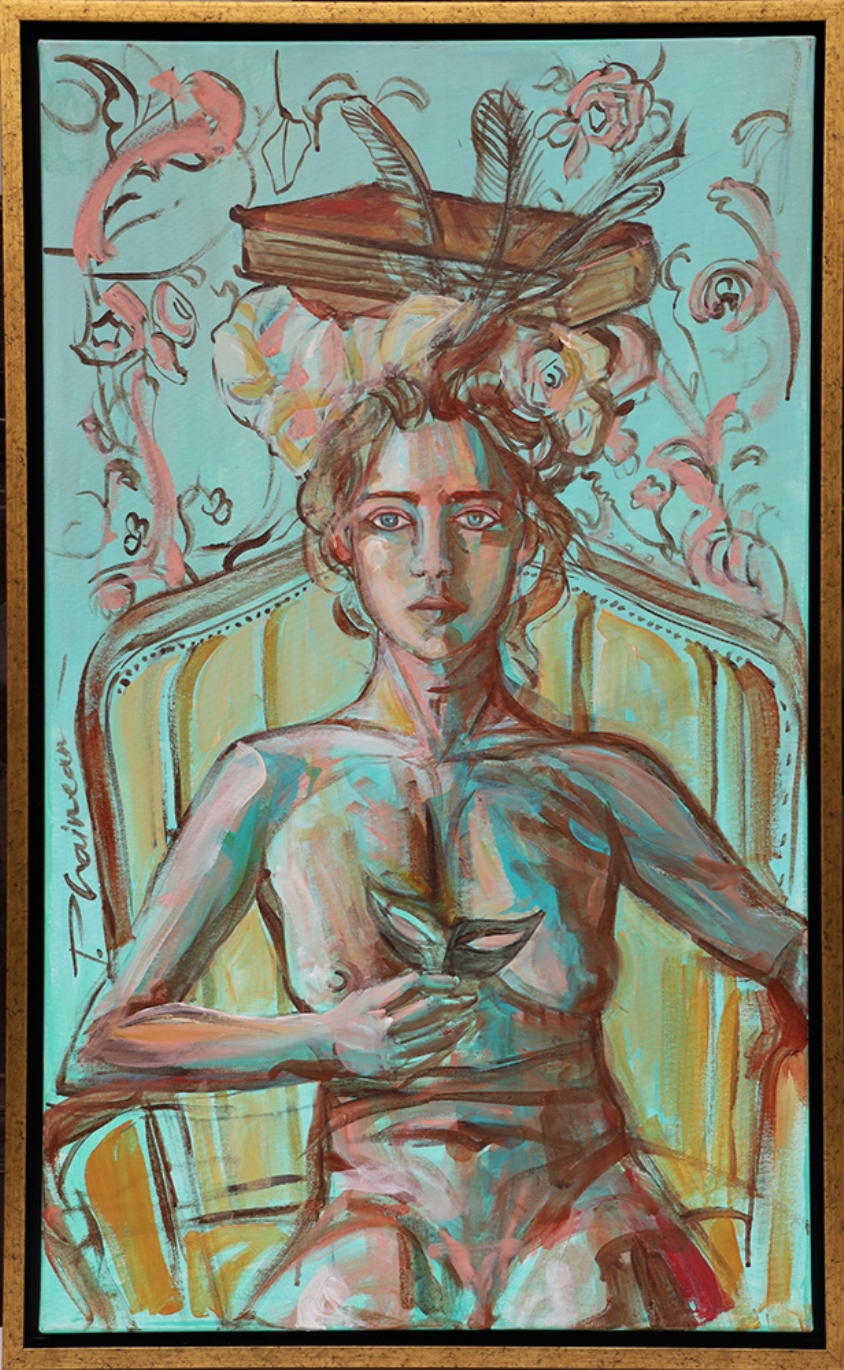 Am mers în calitate de vizitator, cu mulți ani în urmă și mi-am dorit ca într-o bună zi să particip. În calitate de expozant experiența este total diferită. Este grozav să poți discuta direct cu amatorii și cumpărătorii de artă. Am venit în contact cu arta viitorului, am interacționat cu oamenii, am găsit printre vizitatori, galeriști, artiști, un mare entuziasm. Prima participare la un târg internațional a fost acum 6-7 ani cu această galerie, bG Gallery din Los Angeles. Este cea care ma reprezintă în SUA și care mi-a expus lucrările prima dată la Los Angeles Art Show, un târg important de pe coasta de vest, care are loc anual în februarie. La început mi-au expus lucrări de mici dimensiuni, iar apoi, văzând că au succes, au adus la târg lucrări din ce în ce mai mari. Această galerie m-a reprezentat și anul acesta la Miami, pe coasta de est, în Florida. Am participat alături de alți artiști pe care galeria îi reprezintă, cu lucrări care au ca figuri centrale personajele feminine și pe care le puteti vedea și aici. Ambele picturi, Lady with Books #1 și Lady with Books #3, înfățișează câte un personaj feminin având cărți echilibrate pe cap, simbolizând înțelepciunea, cunoașterea, introspecția. Scaunele adaugă un sentiment de stabilitate, în timp ce fundalurile florale transmit rafinament și frumusețe organică. Privitorii se pot regăsi în cele două personaje, ca într-o imagine în oglindă, fiind de fapt diverse fațete ale femininătii. Feminitate dar și profunzime și fantezie, pentru că nu sunt niște personaje reale. Cărtile se află așezate neașteptat pe capul personajelor, într-un mod simbolic. Picturile fac parte dintr-o serie mai mare care simbolizează feminitatea și intelectul, eros și logos, echilibrul între sinele interior și așteptările exterioare ale societății.