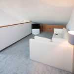 Având în vedere că ușa garajului ocupă fațada, intrarea principală a casei se află pe una dintre laterale și conduce într-un hol compact, care are în partea stângă living combinat cu bucătărie, în față o baie, iar în dreapta o scară care urcă spre dormitor. Aici, forma neobișnuită a design-ului face ca tavanul să fie foarte aproape de podea într-un anumit punct. De asemenea, living-ul are ieșire către terasă și peluză.