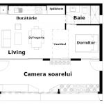 Cu un design contemporan și orientat spre confort, casa de 75 de metri pătrați este compusă din două segmente. O secțiune, denumită camera soarelui, este orientată spre nord și se întinde pe toată lungimea casei, având geamuri etanșe de la podea până în tavan.