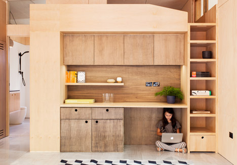 Zona pentru locuit, orientată înspre sud, constă într-un living cu bucătăre open space într-o parte și în dormitor și baie în partea opusă. Mobila și pereții interiori sunt realizați din lemn sau materiale certificate ca fiind non-toxice.