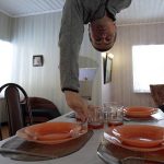 Ocupanții acestei locuințe par să meargă pe tavan. În bucătărie, o femeie sfidează gravitația încercând să deschidă frigiderul, iar în sufragerie un bărbat pregătește masa atârnat de tavan. De fapt, nu este altceva decât o iluzie optică: oamenii stau cu picioarele pe pământ, însă această casă din Rusia are toată mobila suspendată de tavan și este o atracție turistică populară.
