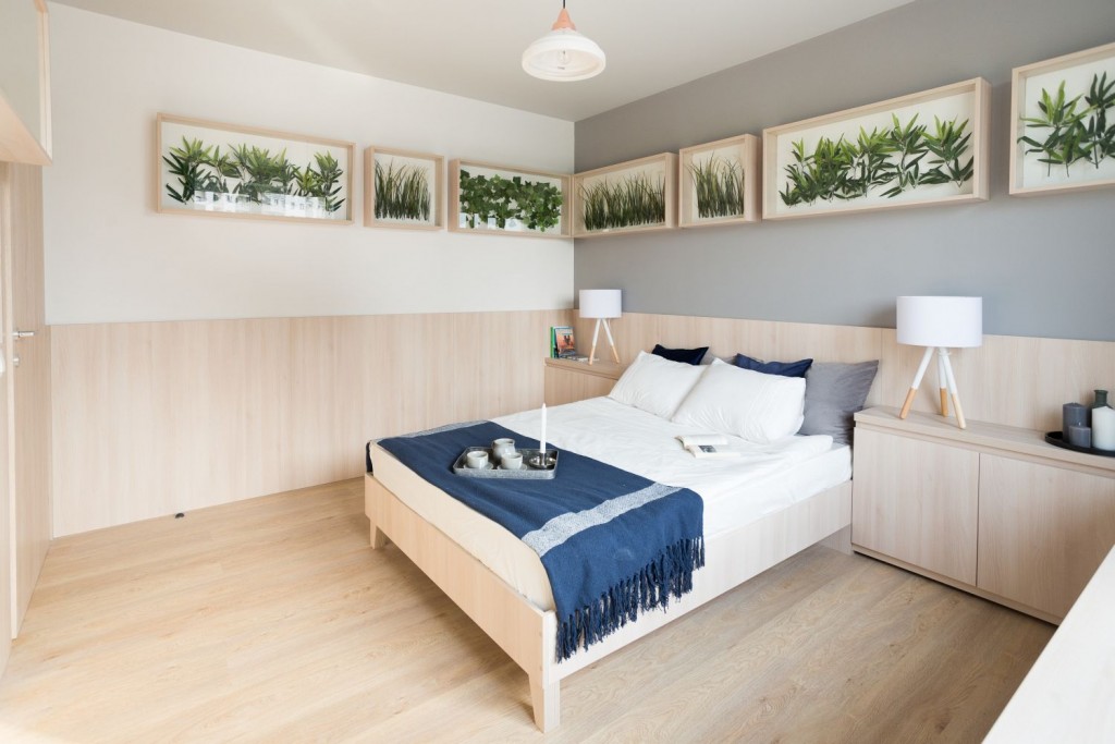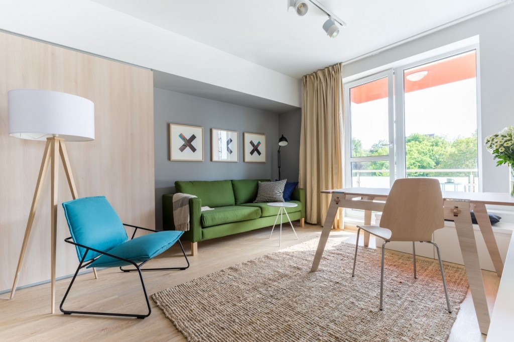 Un alt apartament, cu trei camere şi cu o suprafaţă de 64 de metri pătraţi, a fost amenajat de arhitecţii Atilla Kim, Bogdan Ciocodeică şi Diana Roşu. Cei trei au realizat un proiect spectaculos, iar materialul lemnos, culorile deschise, plantele şi lumina naturală au definit astfel un spaţiu strâns legat de exterior. Bugetul de 11.200 de euro include electrocasnicele de la Whirlpool, piesele de mobilier făcute pe comandă, accesoriile şi decoraţiunile.