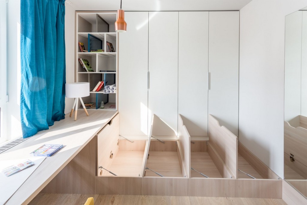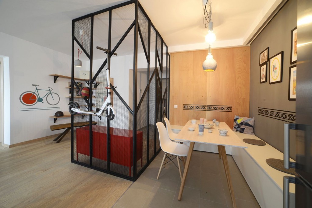 Bugetul de amenajare pentru un apartament cu patru camere cu o suprafaţă de 85 de metri pătraţi a fost de 13.000 de euro. Echipa de design interior a Dizainăr, formată din Marilena Popa şi Mihnea Ghilduş, au gândit amenajarea pentru o familie tânără cu doi copii. Pentru fiecare cameră a fost creată o poveste diferită. Tema aleasă pentru dormitorul părinţilor este campingul, iar temele din dormitoarele copiilor sunt o căsuţă în copac şi natură cu flori şi păsări. Pentru compartimentarea spaţiului deschis, designerii au folosit trei panouri cu structură metalică, numai bune pentru agăţat bicicleta, trotineta şi rachetele de tenis. Iată mai jos ce a ieşit.
