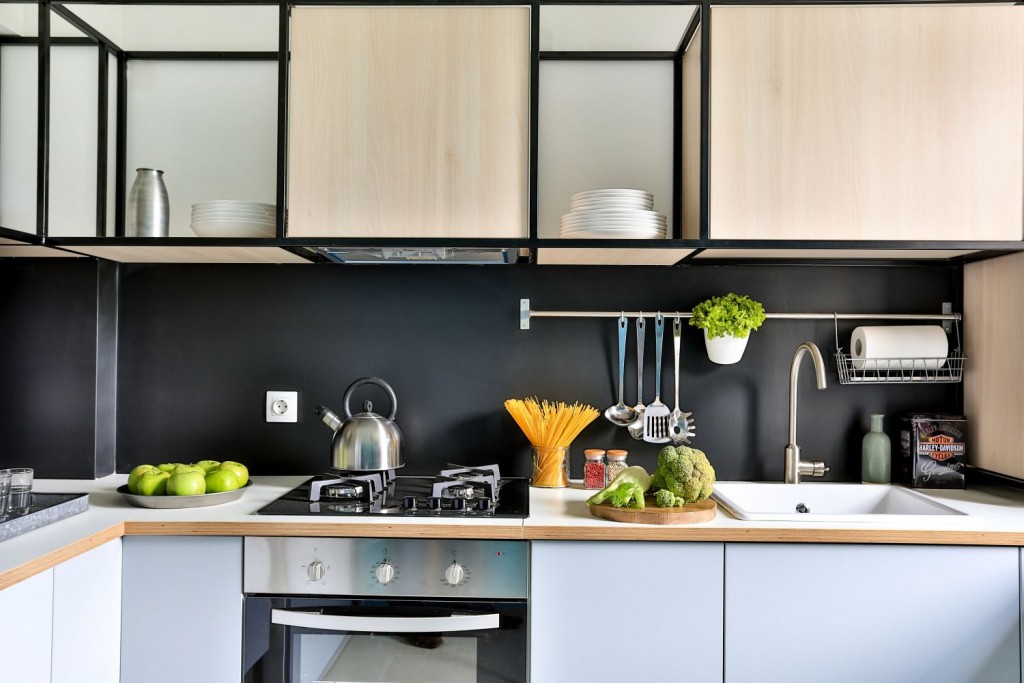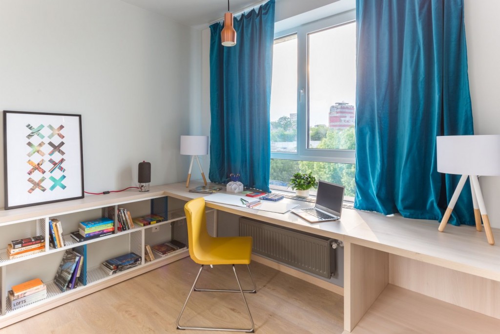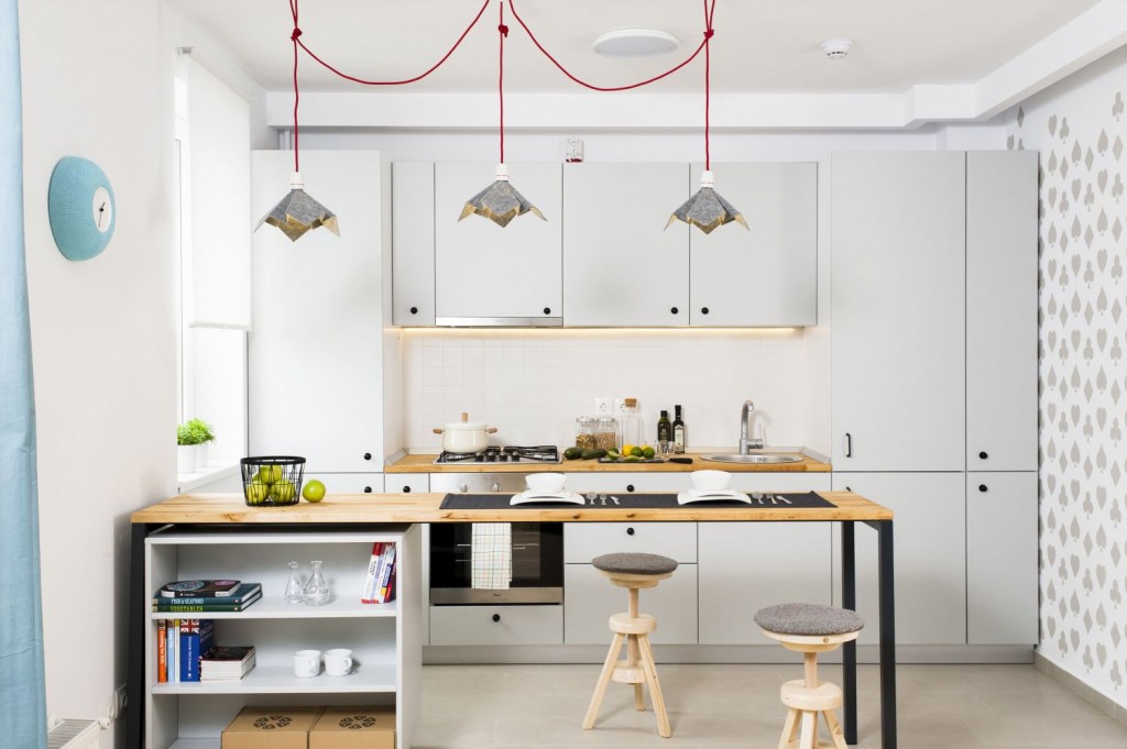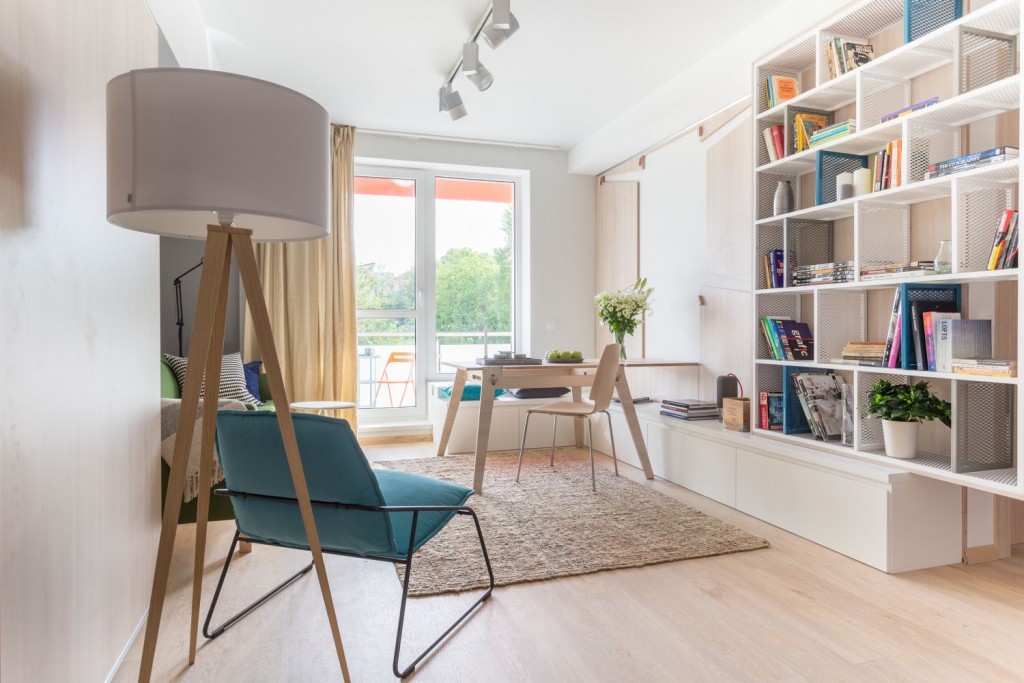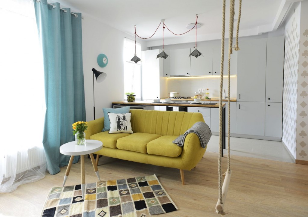 Începem cu o garsonieră de 36,75 metri pătraţi din cadrul The Park. Elis Popescu de la Designist.ro a pornit de la ideea de a contura un decor urban, cu accente ludice, presărat cu elemente mai puţin convenţionale: leagănul ce completează zona de conversaţie, etajere cu cărţi stivuite pe post de noptiere sau ilustraţii cu mesaje care invită la interpretare.