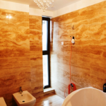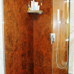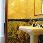 În baie frumusețea, rezistența la umiditate și lipsa riscurilor alunecării, sunt caracteristicile esențiale pe care le avem în vedere. În acest caz granitul, marmura, travertinul sau onixul sunt necesare pentru placările din baie. Pardoselile se vor finisa fără lustru, pentru a evita alunecarea. Se pot utiliza și inserții cu plăci lustruite în zone unde este nevoie de reflexii și luciu, pentru a avea mai multă lumină și senzația de spațiu. Pereții și blaturile din baie vor fi mai bine protejate de mucegai și igrasie datorită pietrelor naturale care au porii mult mai deschiși astfel încât pereții vor fi mult mai bine aerisiți.