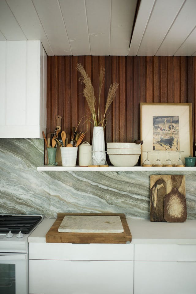 În această bucătărie, la capătul blatului a fost adăugată o bucată de marmură verde, ceea ce aduce un strop de lux. Aceasta este o modalitate foarte bună de a adăuga piatră într-o bucătărie, asta dacă nu îţi poți permite să faci tot blatul într-un material mai scump.
