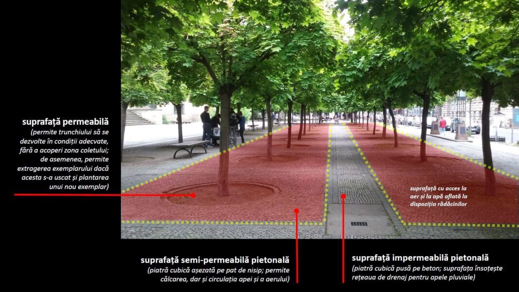 „Nu există, de fapt, o soluţie universală, dar există, de exemplu, posibilitatea de a acoperi pământul respectiv cu alte plante: cu arbuşti sau plante erbacee perene. Această situaţie nu poate fi folosită peste tot. De exemplu, atunci când punem arbuşti pe aliniamentul de pe marginea drumului, ei sunt acoperiţi cu zăpadă în perioada de iarnă, când se deszăpezeşte. Sunt turtiţi, sunt omorâţi, practic, la un moment dat. Dar sunt şi alte soluţii, precum folosirea de materiale semi-permeabile. La noi, de exemplu, acest concept de suprafaţă semi-permeabilă nici nu există. Şi aici nu mă refer la beton. Mă refer la nişte materiale, cum este pietrişul stabilizat cu stabilizator natural, care – atunci când există această presiune de creştere a trunchiului – cedează uşor-uşor şi arborele poate să crească”, a explicat ea.