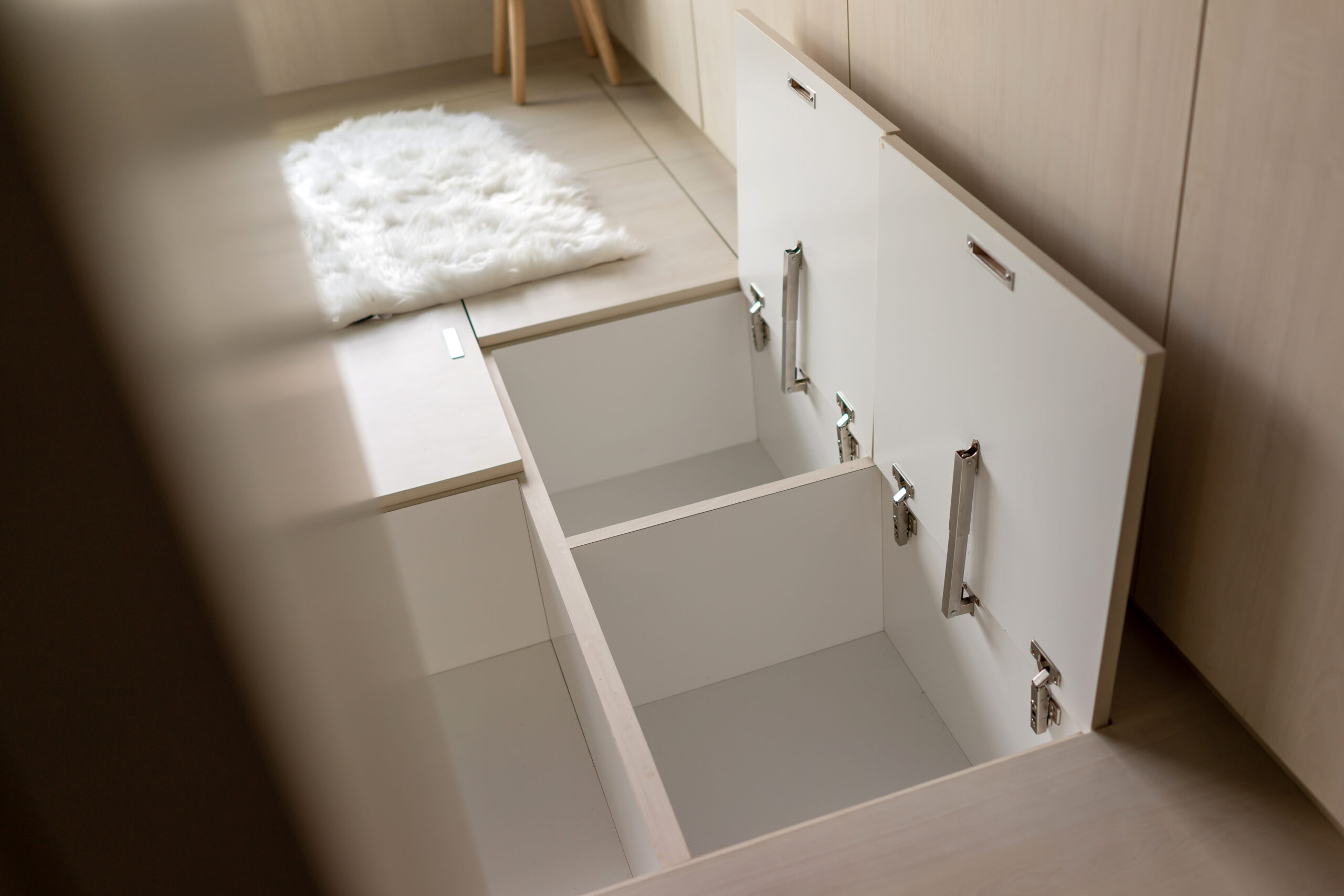 Alege mobilier cu spații ascunse, cum ar fi otomanele sau băncile cu depozitare. Dulapurile până în tavan sau sertarele integrate în treptele scărilor sunt alte idei practice.