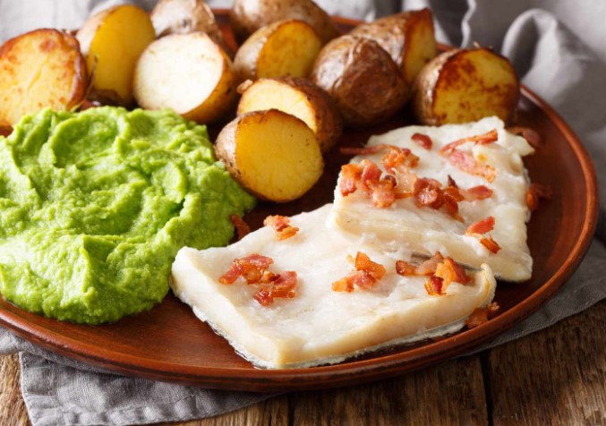 Este adesea servit cu cartofi fierti, sos de unt și mazăre verde.