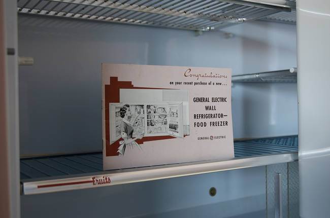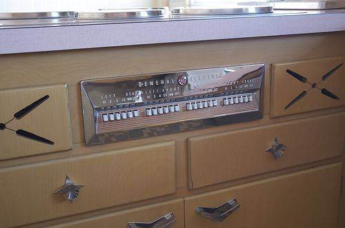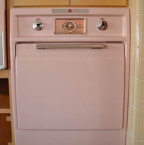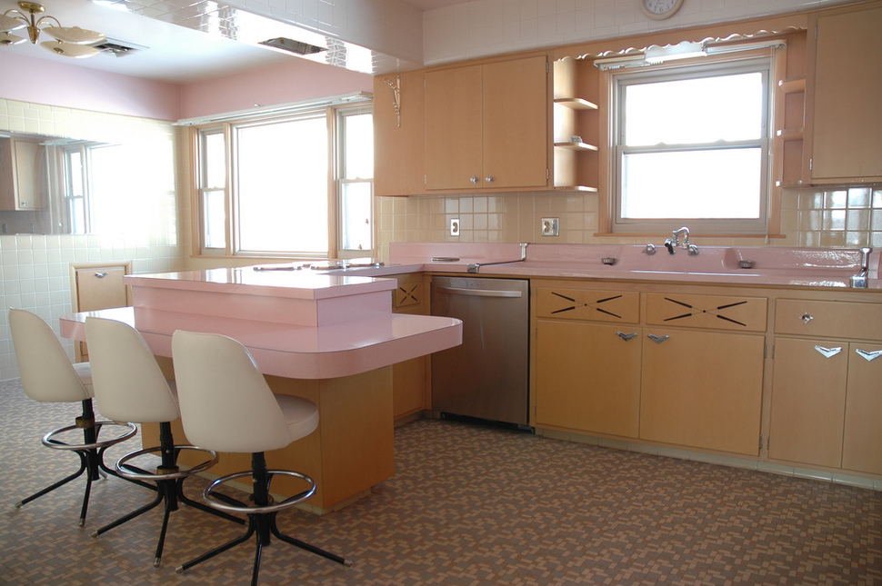 Stilul anilor ’50 este prezent peste tot, de la nuanțele de roz pastel, la butoanele și mânerele aparatelor electrocasnice.