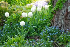 Ȋn grădină, Nu-mă-uita formează aranjamente pline de culoare cu lalele, narcise și zambile.