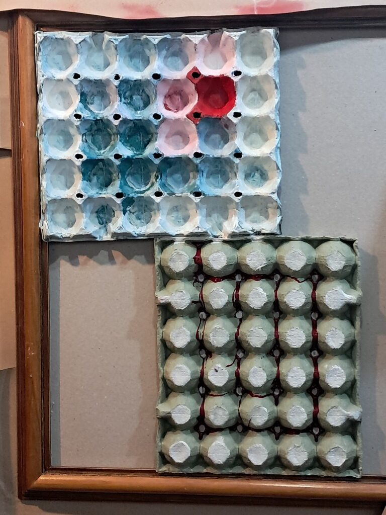 Folosind drept suport ambalajele de ouă, lucrările lui Christian Zidros sunt semne ale memoriei subiective și complexității formei pe care privitorul trebuie să le descifreze. Banalele suporturi de ouă prin viață și transmit o vibrație puternică.