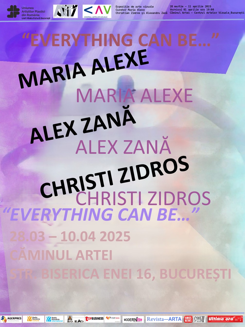“Un tip prezentare inedit, datorat atât modului de panotare, cât și imaginilor oferite publicului și pe care am început să îl practicăm de un an, se dovedește astăzi a fi pe gustul publicului. Cei doi atiști, Christian Zidros și Alexandru Zană, absolvenți ai Universității Naționale de Arte, terminând înainte și alte facultăți, au mers mai departe și au transformat expoziția prezentă într-un performance în care publicul și artiștii sunt în mod egal actorii unui spectacol vizual creat de imaginile care intră în dialog cu publicul, implicându-l în transmiterea mesajului. Titlul ales de autori Everything can be… nu e o simplă invitație la dialog, e o invitație la gândire și la implicare. Punctuația, cele 3 puncte, sugerează faptul că privitorul poate și chiar trebuie să interpreteze lucrările conform proriei sale înțelegeri”, a spus Maria Alexe, curatoarea expoziției, la vernisaj. De altfel, cu acest prilej, Căminul Artei s-a dovedit neîncăpător față de numărul mare de vizitatori.