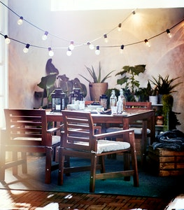 Ghirlandele luminoase din familia SOLVINDEN te pot ajuta și de data aceasta să întreții o atmosferă intimă în spațiul din exteriorul casei tale. Lumina decorativă plăcută pe care o răspândesc nu este singura lor calitate; aceste corpuri de iluminat economisesc energie și reduc impactul asupra mediului înconjurător. Optează și pentru câteva pături din gama OMTÄNKSAM în cazul în care noaptea devine răcoroasă, iar acum tot ce trebuie să faci este să te relaxezi și să te bucuri de întreaga seară.