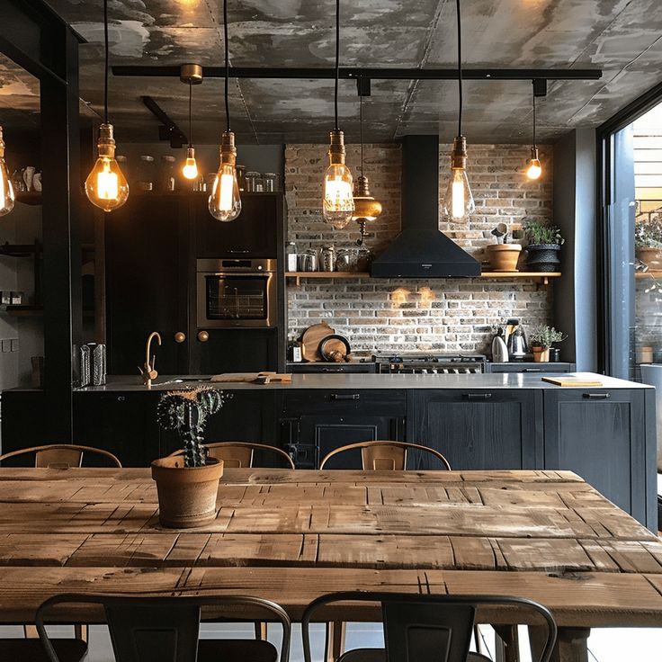 Alege un candelabru din metal sau un șir de lumini deasupra blatului de lucru, pentru un cadru versatil care să-ți ofere suficientă lumină atunci când vrei să gătești. Pentru un decor armonios, alege un cuptor sau o plită din metal. Hota poate fi din același material, iar evacuarea este recomandat să rămână expusă. Accesorii precum ceainice, tăvi, suporturi pentru condimente sau lăzi pentru pâine din metal pot adăuga farmec industrial bucătăriei tale.