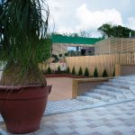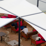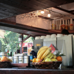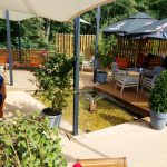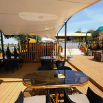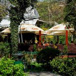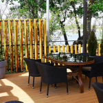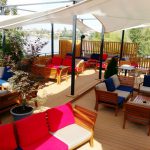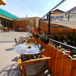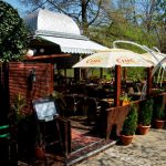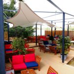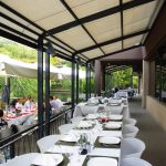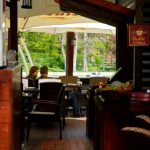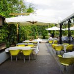 Amenajarea terasei este relativ simplă, cu multe plante ornamentale naturale, scaune cu perne moi viu colorate, cu nuanțe de roșu, albastru și alb, mobilierul fiind din lemn, altul din ratan, deasupra la unele mese sunt pânze albe menite să creeze umbră, în rest este multă lumină și un decor verde plăcut dat de împrejurimile parcului.