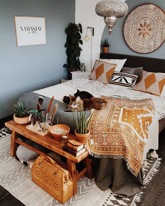 Accesoriile textile și decorațiunile sunt foarte importante în designul de tip Bohemian Chic. Cu cât sunt mai multe și mai diferite, cu atât mai bine! Umple canapeaua cu pernuțe decorate cu imprimeuri florale sau etno, acoperă pardoseala cu preșuri tradiționale multicolore, covoare marocane sau covoare persane reinterpretate, iar pentru pat folosește pături vesel colorate, dar și dantele sau broderii. De asemenea, acordă o atenție specială obiectelor personale și celor care fac trimitere la anumite culturi: amintiri, fotografii, decorațiuni de inspirație etnică, elemente vegetale etc. Practic, înconjoară-te de orice lucru care te inspiră și te reprezintă.