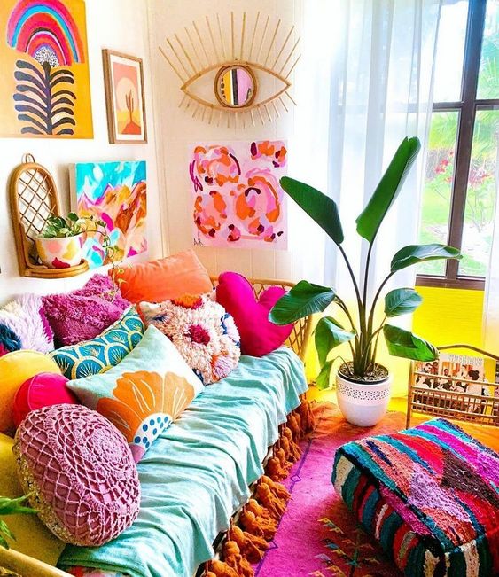 Multe amenajări BoHo au ca numitor comun cromatica frapantă. Culori vibrante precum oranj, violet, verde, turcoaz, albastru electric etc. sunt prezente în asocieri, combinații și intensități care nu au nicio legătură cu regulile armoniei cromatice. Și totuși, ele reușesc să funcționeze foarte bine împreună și să spună „povești”. Alte interioare transmit același spirit boem prin intermediul unor game de culori calde, potolite. Așadar, tu decizi pe ce schemă cromatică mergi.