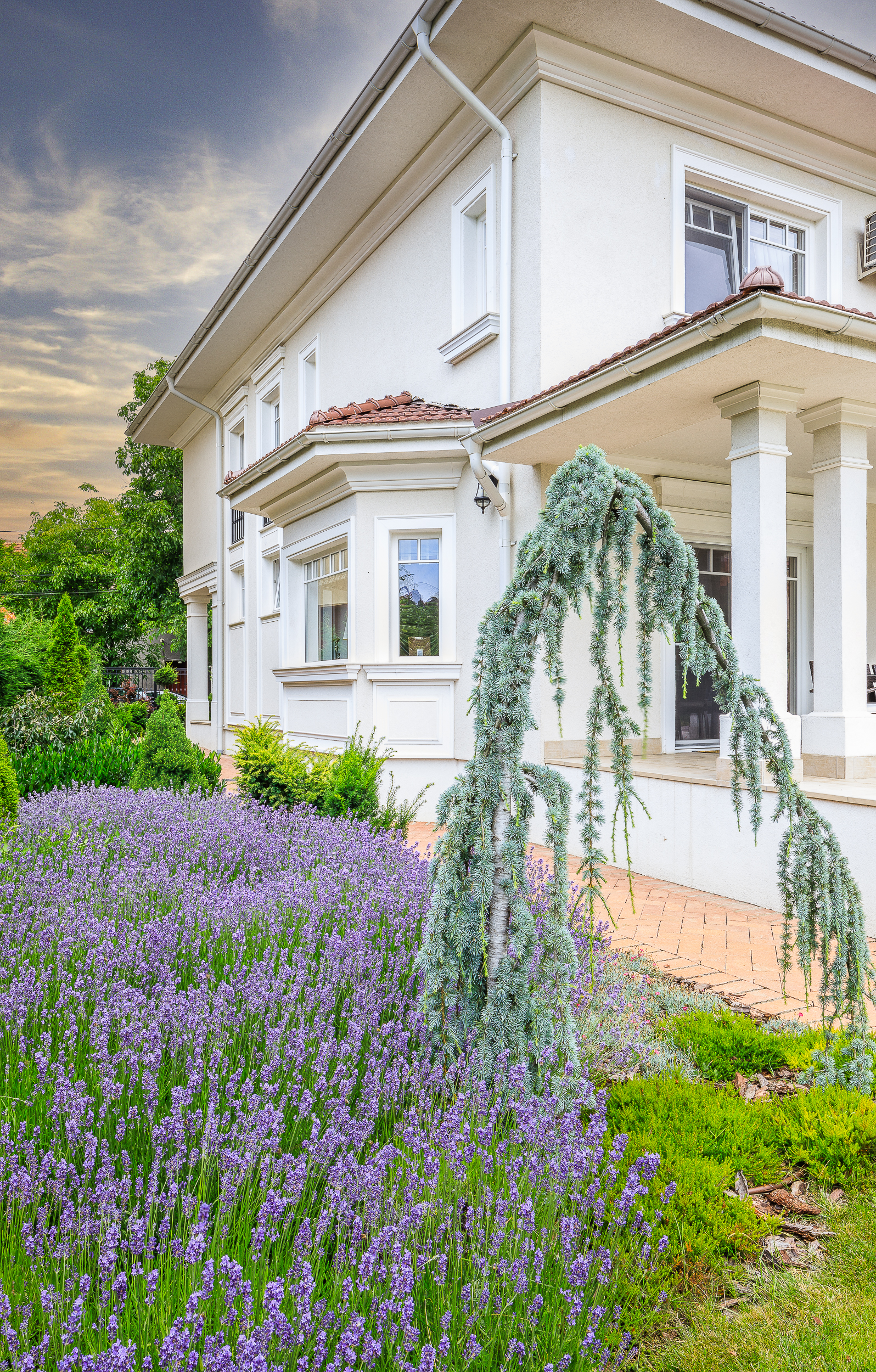 Un exterior cu flori şi terasă acoperită