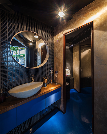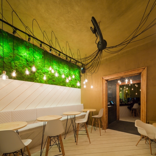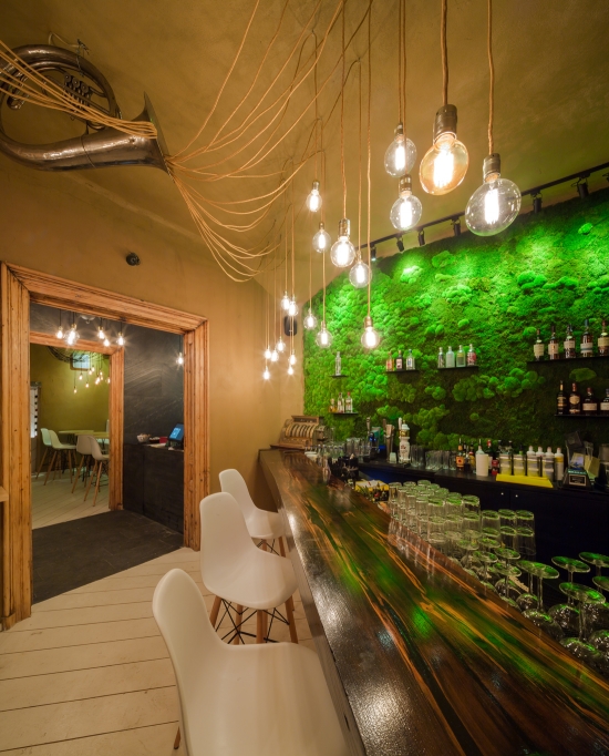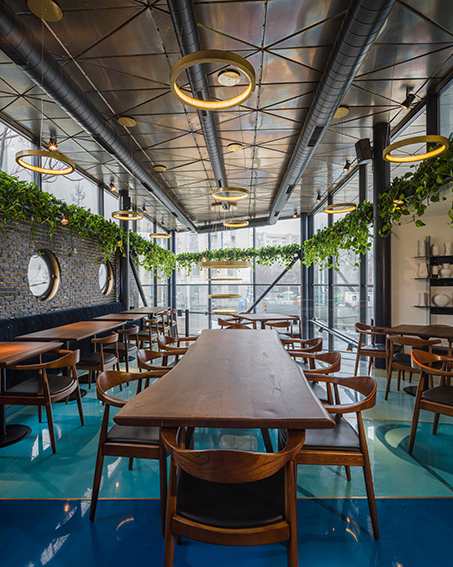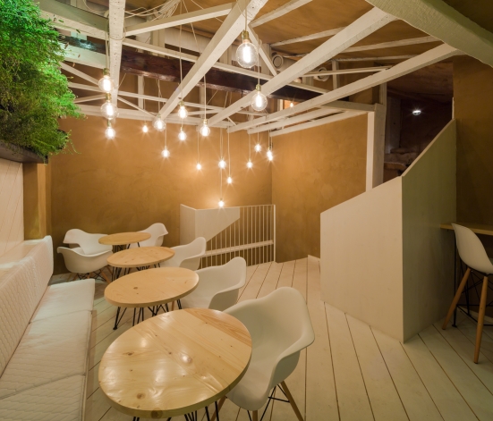 Pentru Restaurantul Shift s-a dorit realizarea unui spaţiu interior care să fie o extindere a grădinii existente. A fost scoasă la vedere structura şarpantei pentru a mări înălţimea spaţiilor de la etaj. Restul compartimentărilor au rămas ca în planul iniţial al casei. Vechii pereţi de cărămidă au fost tencuiţi cu lut, material 100% natural, folosit în arhitectura ecologică. Pentru restul elementelor existente s-au utilizat tot materiale inspirate din mediul natural: lemn pentru pardoseală, pereţi şi mobilier montat pe diagonală pentru a anula imperfecţiunile şi neparalelismele de plan ale casei vechi.